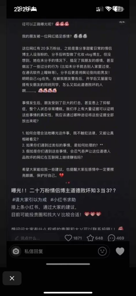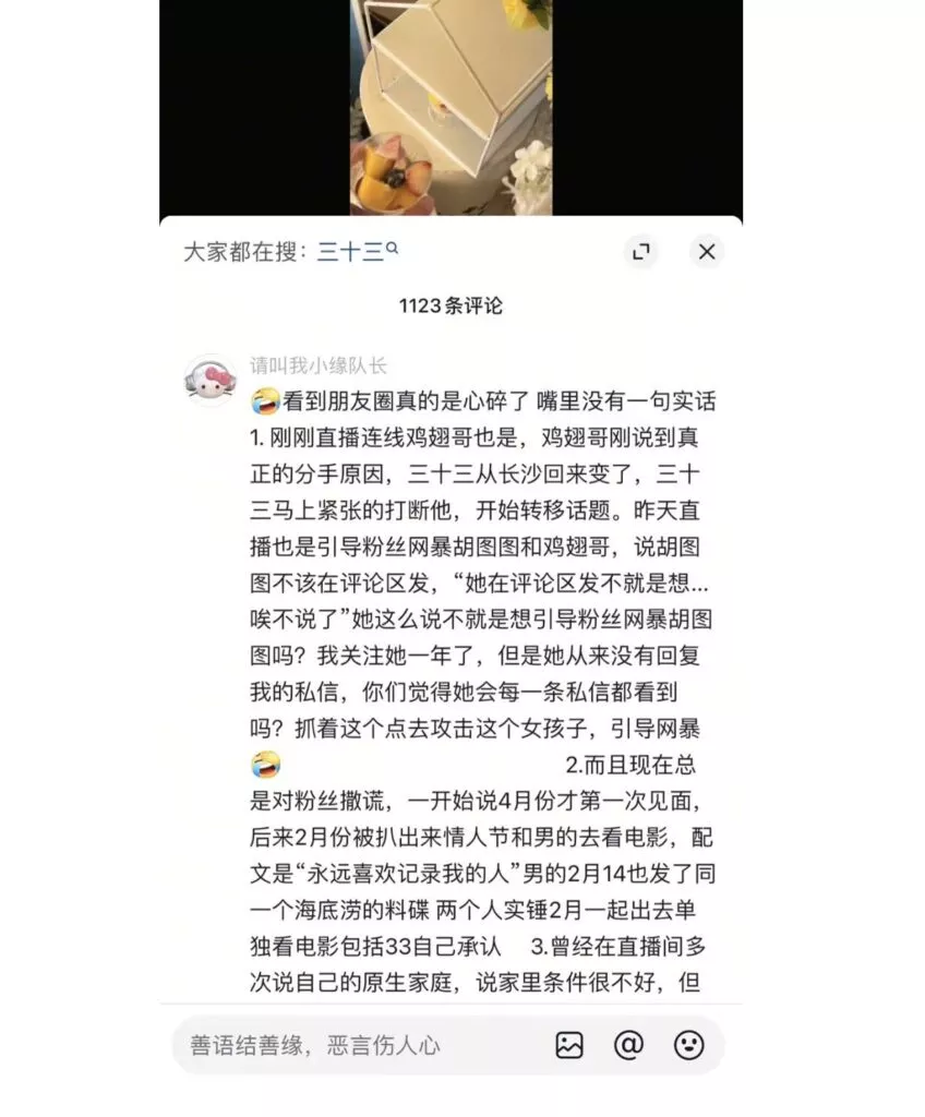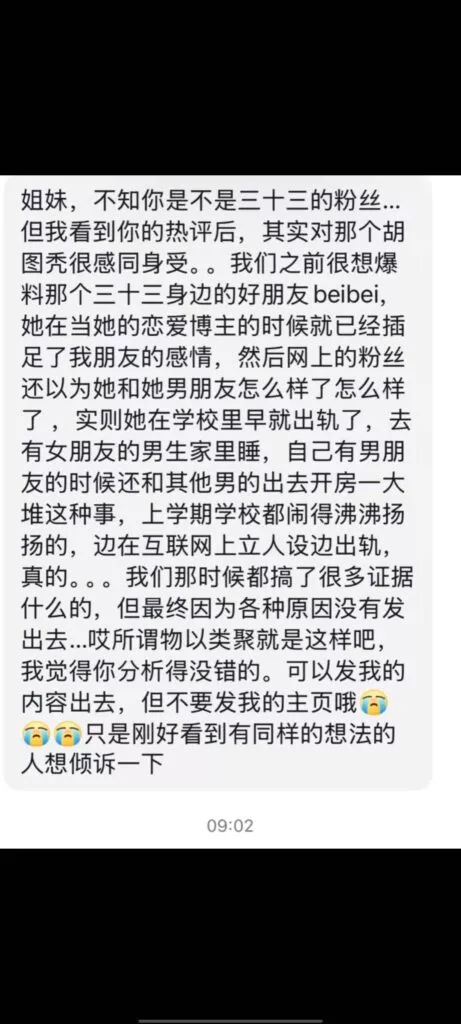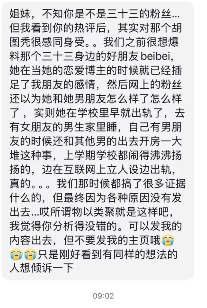 先提车后分手,抖音40万粉丝清纯网红三十三,打着一手清纯好女孩的人设,实际非常拜金,周旋于数个男人之间,卖弄清纯人设,利用完后果断丢弃,甚至伪造事实,引导粉丝网暴前男友。