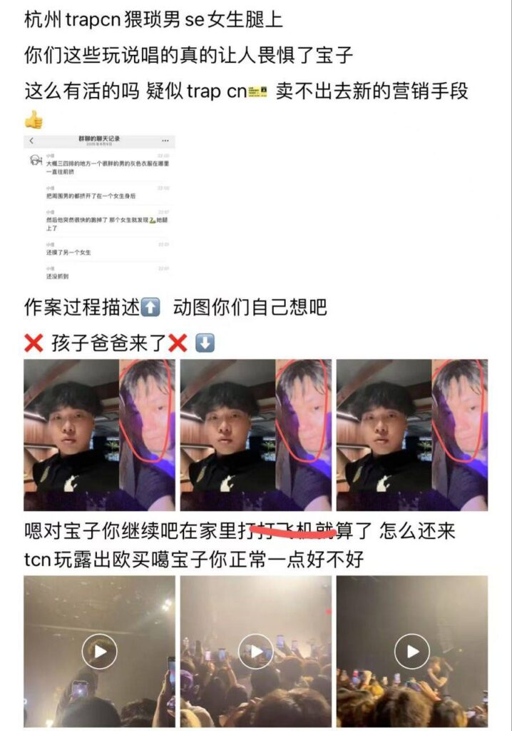 TRAPCN演出现场,说唱歌手APMOZART表演过程中,一名女子对正在努力营业的歌手求助,此后在女子的叙述下才得知,现场竟然出现一位逆天猥琐男做出猥亵行为,好好地一场巡演,差点让努力营业的歌手变成了91上的素材。