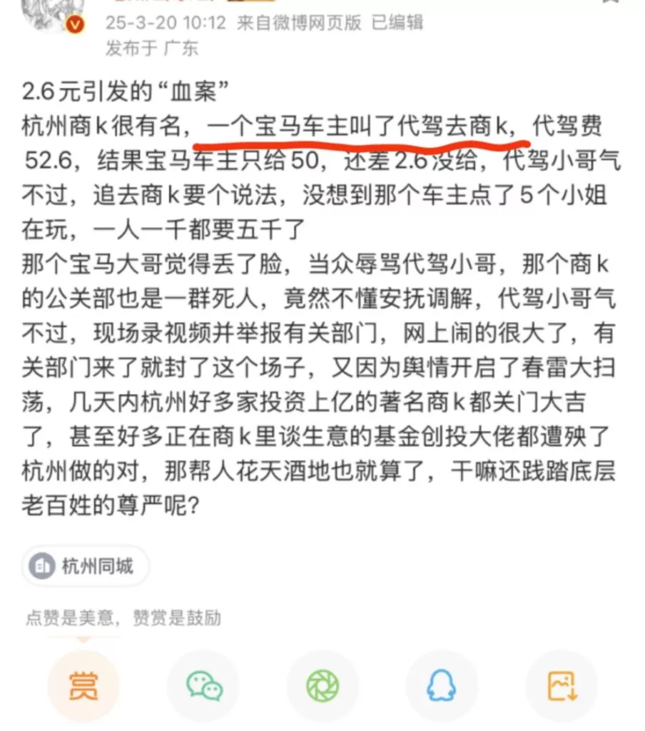 有钱在商K点嫩妹陪玩陪睡陪喝,没钱给代驾小哥付2.6元的代驾费,有钱给KTV公主打赏千元,却没钱给代驾小哥结算最后的2.6元。代驾小哥一怒之下当即报警,涉事KTV当夜被查封,宝马车主当晚被拘留,杭州百亿产业项目连夜被拔,都是泪啊!