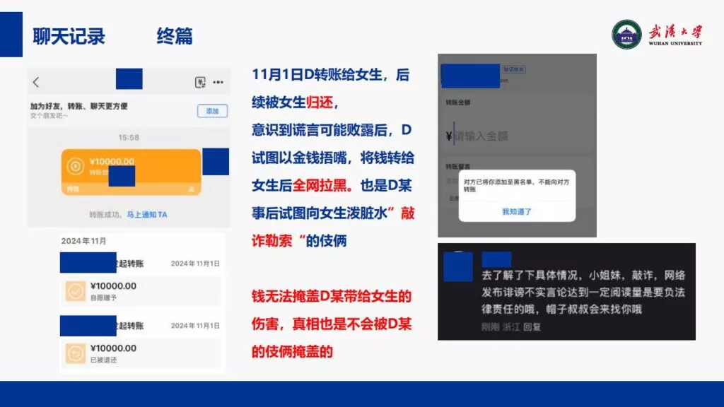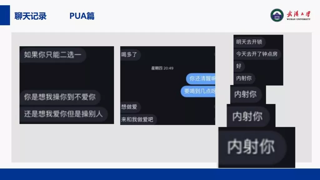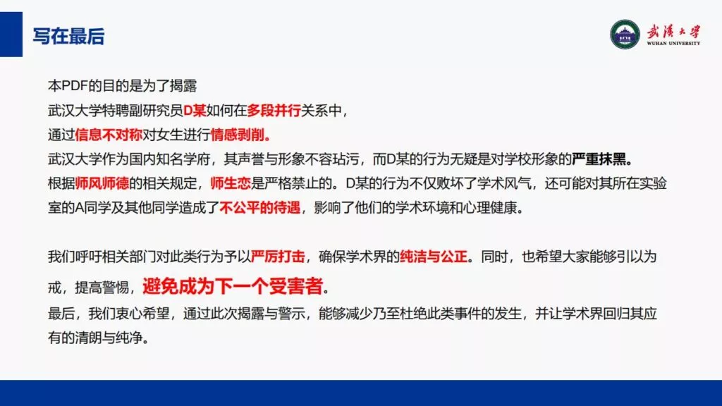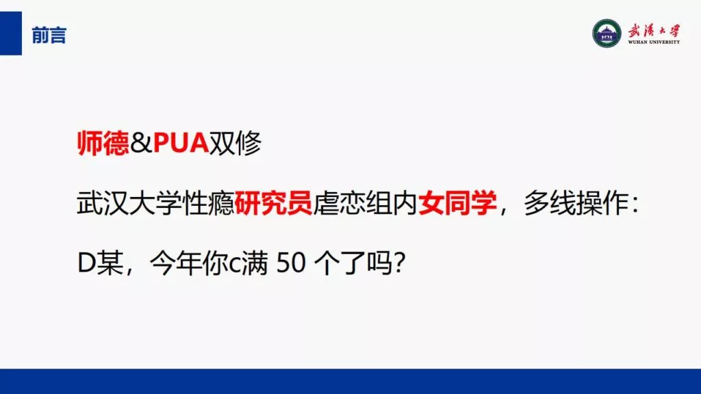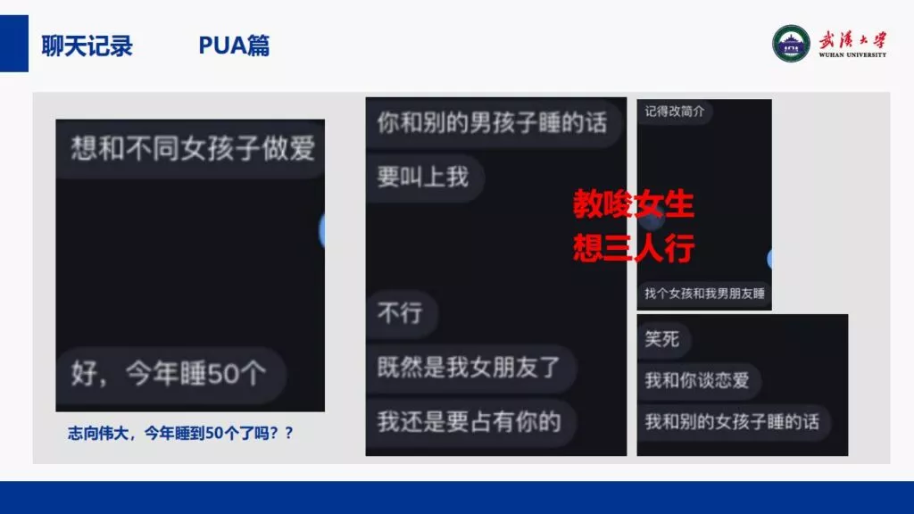 24页PPT揭露了武汉大学特聘副研究员的不当行为。他的师德败坏,令人失望,真可谓人渣中的人渣。同时,他与多名女生交往,向每位女生声称是真爱,简直可以称为顶级时间管理大师。他的一些经典言论更是毫无道德可言,彻底破坏了师德。他甚至扬言要“c满50个”。