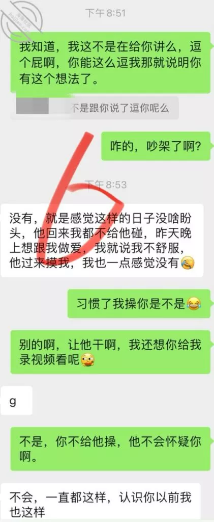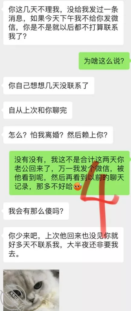 兄弟们,我最担心的事情还是发生了,昨天她老公回来了,这老兄也真逗的,我如果没记错她应该又快来大姨妈了,上次回来也是赶上来姨妈;今天也不知道是咋的了,到底是吵架了,还是就单纯的看着烦,问了也没跟我说具体的,反正所以就有了以下的聊天记录,哎,大家自己看吧,我现在真的是愁得很:兄弟们,虽然这个话题是略过了,但是我现在依旧还是很担心,女人这个东西吧,我是比较了解的,对于她们而言,尤其这种良家女,基本没有单纯身体出轨这一说,一定是身心一起的;虽然说是逗我的,但我不太相信,她一定是有这个想法,最起码是在那一瞬间是有这个想法了,而且还会纠结了很久才会发那条消息给我;说真的,这是我最担心的事情,我是不可能跟她过的,这点我很确信,首先我不想为了一棵小草放弃整片森林,我现在完全不想再有束缚,再有,我如果希望有个完整的家庭,那我肯定首选跟前妻复婚,再然后,我就算复不了婚,我大概率也不会去找个离婚的女人,