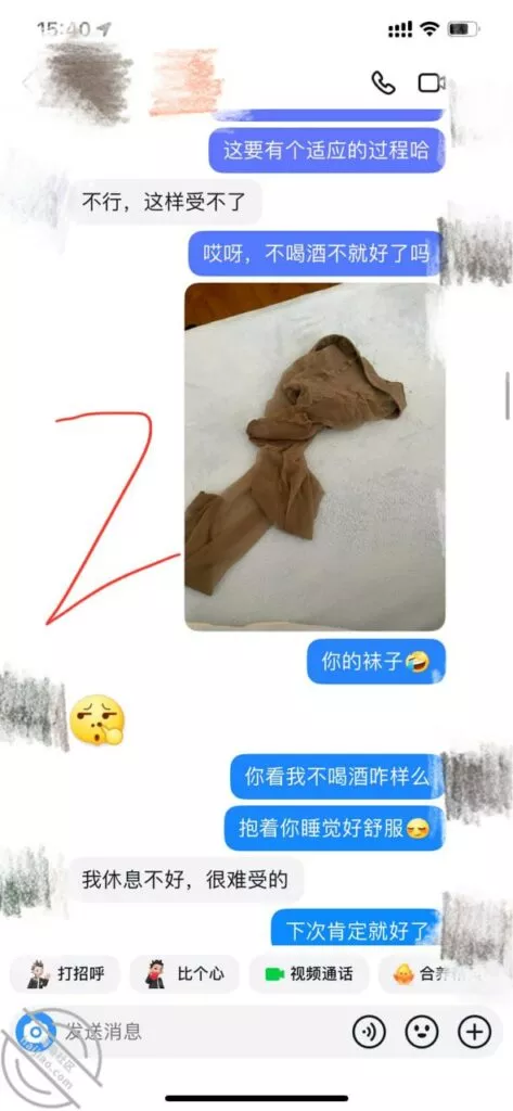 虽然过程有点坎坷,不过好在结果还好,之前不是说到约好了晚上一起到我家吃饭嘛,那自然是少不了酒的,毕竟喝了酒好办事嘛。因为我发小这几天刚好在我所在的城市出差,陪完领导来我家找我,我又跟发小一起喝上了,结果这就把我给喝多了……然后中途女邻居说困先回去,这下我就慌了,好在最终软磨硬泡,连哄带骗的又给弄回来了。不过说什么也不给我录视频,事先准备好的验证纸条也没用上,中间软磨硬泡,连哄带骗的聊天记录就不发了,喝醉了说的话太磨叽,就不给大家看了,下面几张图是睡醒后给他发的消息,晚上拍的照片,不给录视频,照片总要拍几张,哈哈哈,落在我家的内裤和丝袜,早晨他居然是短裙真空回去的,想想好刺激啊哈哈!有没有那种有特殊癖好的兄弟们,给你们寄过去,这个大扔子给大家欣赏一下,真的好大,