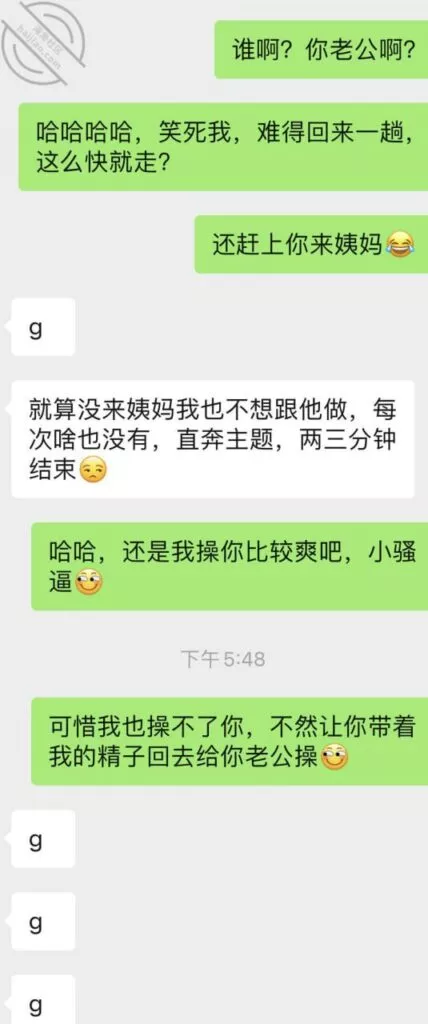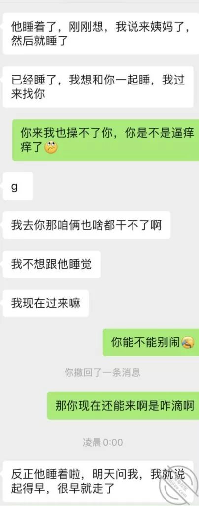 我也挺可怜,之前心心念念的等她老公来,然后体内释放她,让她B里夹满我的体液回去,让她老公舔,然后带着我的体液再被她老公Cao,可惜实现不了了,怎么就非要在姨妈来的时候回来,我俩今天聊天记录,这两天晚上我都没留她在我这睡,因为来姨妈了么,留下也干不了啥,我也觉得无聊,所以这两天每天晚上自己喝喝酒打打游戏,她就是来呆一会然后回自己家睡觉;这小娘们现在已经离不开我了,不跟我一起居然都睡不好了哈哈,不知道今天晚上跟他老公睡觉,会不会习惯性的喊个爸爸,或者给她老公玩个足交啥的,那样估计她老公马上就能想到她外面有人了吧,因为毕竟以前从来没玩过,哎,我的计划也泡汤了,心里太不爽了,还是要等下次了,不知道下次什么时候她老公才能再回来;已经第三天了吧,再有几天就可以Cao她了,很多兄弟们心心念念的小玩具,下次视频帖就可以安排上了