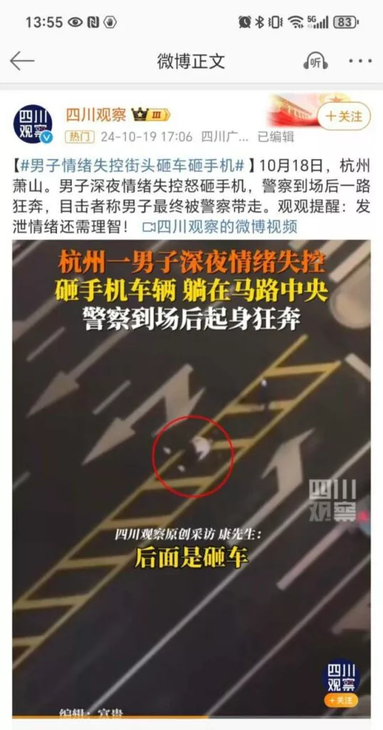 在10月19日,杭州发生了一起引人注目的事件。一名男子情绪失控,在繁忙的街道上疯狂砸毁汽车和手机,随后一头狂奔,最终被警方控制并带走。